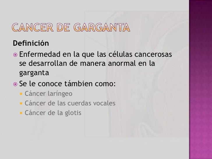 Síntomas de cáncer de garganta cancer sintomas. El cáncer de laringe es un tumor maligno que se origina en las células de la laringe o garganta. Maligno significa que puede propagarse, hacer metástasis, a otras partes del cuerpo. La laringe es parte del sistema respiratorio. Es el tubo que conecta la garganta con la tráquea. Cáncer de cabeza, cuello o garganta síntomas y tratamiento. El consumo de tabaco y de alcohol es uno de los factores claves para desarrollar un cáncer de cabeza y cuello. El 75% de estos tumores son causados por ellos. En españa, se registran cada año entre 12.000 y 14.000 nuevos casos y se espera que la incidencia aumente hasta un 16.000 en los próximos años. Cancer de lengua o garganta image results. More cancer de lengua o garganta images. Síntomas de cáncer de boca (oral cancer sintomas. Dificultad para masticar, tragar, hablar o mover la mandíbula o la lengua. Ronquera, dolor de garganta crónico, o cambios en la voz. Dientes flojos o dentadura que no encaja. Dolor de oído persistente. Cambios inusuales en el sentido del gusto. Pérdida de peso significativa. ¿cuales son los primeros síntomas del cáncer de lengua?. Síntomas del cáncer de lengua. El tipo más común de cáncer de lengua se llama carcinoma de células escamosas. Las células escamosas son células delgadas y planas que están presentes en la superficie de la piel y la lengua, en el revestimiento de los tractos digestivo y respiratorio, y en el revestimiento de la boca, la garganta, la tiroides y la laringe. Signos y síntomas del cáncer de orofaringe y de cavidad oral. Un área blanca o roja sobre las encías, lengua, amígdalas o el revestimiento de la boca un dolor de garganta o la sensación de que hay algo atascado en la garganta que no desaparece dificultad para masticar o tragar.